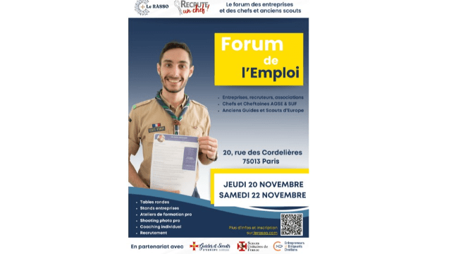 Nous avons le plaisir de vous convier au Forum de l'emploi, le forum des entreprises et des chefs et anciens scouts, les 20 et 22 novembre prochains au 20 rue des Cordelières 75013 Paris.